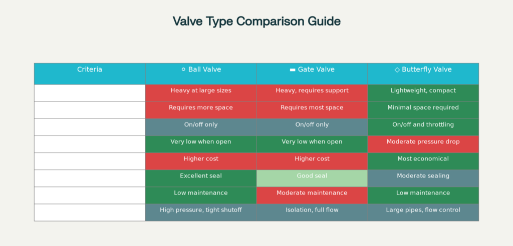 Detailed comparison of ball valves, gate valves, and butterfly valves across key performance criteria